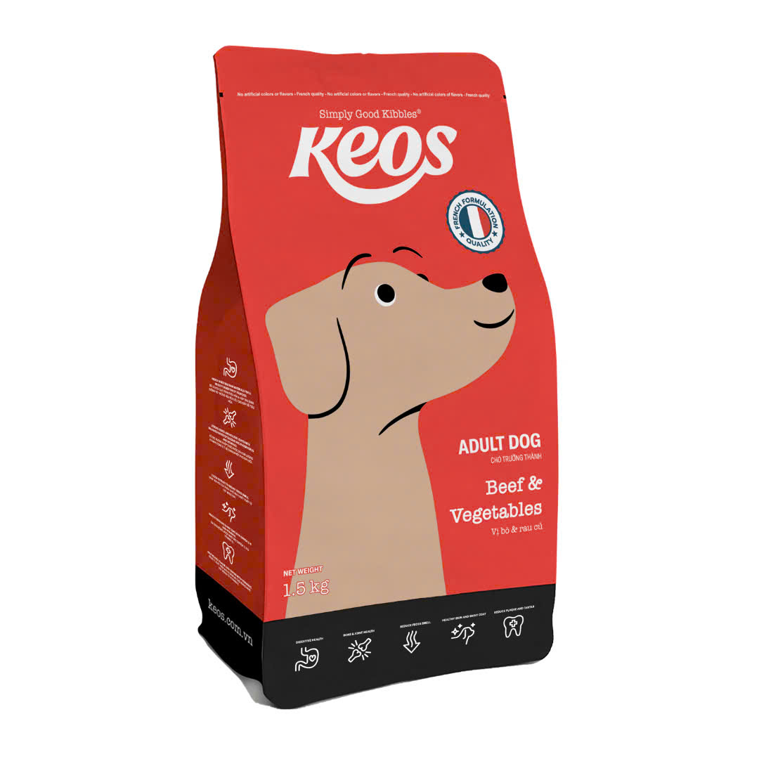 Tên sản phẩm: Thức ăn hỗn hợp cho chó trưởng thành vị bò và rau củ Nhà sản xuất: Công ty Cổ phần VIENOVO VIETNAM Địa chỉ: Lô số 2, đường Trục Chính, Khu công nghiệp Trà Nóc 1, P. Trà Nóc, Q. Bình Thủy, Cần Thơ Thức ăn khô Keos với được sản xuất từ những nguyên liệu cao cấp và công thức đặc biệt chuẩn Châu Âu sẽ cung cấp dinh dưỡng toàn diện, giúp cún cưng của bạn phát triển bền vững và giữ được sự khỏe mạnh, năng động lâu dài.LỢI ÍCH