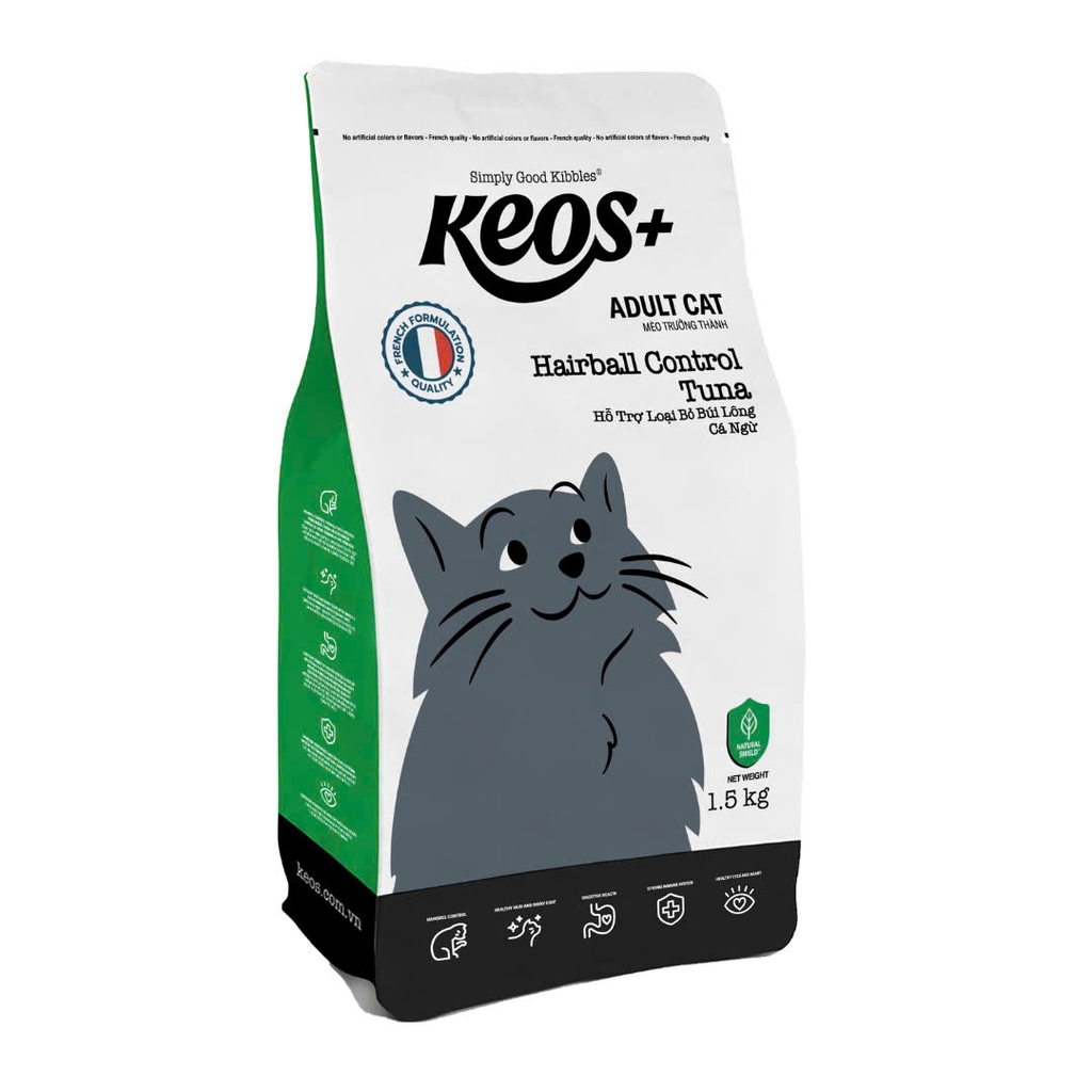 Tên sản phẩm: Thức ăn hỗn hợp cho mèo trưởng thành với công thức hỗ trợ loại bỏ búi lông Nhà sản xuất: Công ty Cổ phần VIENOVO VIETNAM Địa chỉ: Lô số 2, đường Trục Chính, Khu công nghiệp Trà Nóc 1, P. Trà Nóc, Q. Bình Thủy, Cần Thơ Mèo rất hay tự vệ sinh cơ thể của mình bằng lưỡi, vậy nên chúng sẽ vô tình nuốt rất nhiều lông của chính mình vào bụng. Keos+ Hairball Control với các chiết xuất thảo dược sẽ giúp mèo thải các búi lông ra ngoài theo đường bài tiết, cải thiện hệ tiêu hóa và giữ sức khỏe ổn định lâu dài.LỢI ÍCH